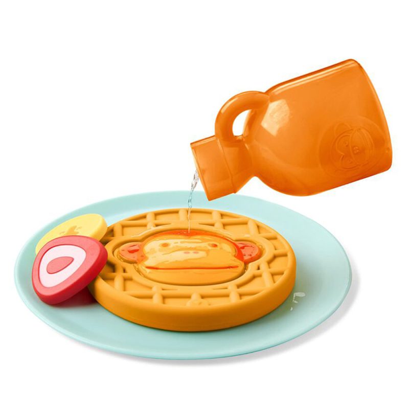 -Incluye 8 piezas: una “plancha” de gofres, una bandeja de servicio, gofre de cambio de color, 2 rodajas de plátano, 2 de fresa, botella de jarabe con efecto mágico (aplica agua fría y aparece un rostro de mono).