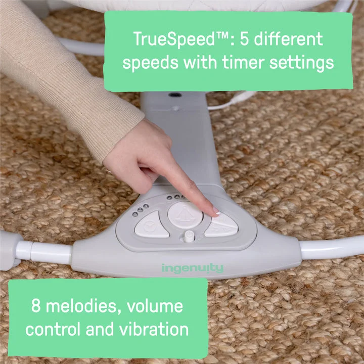 – Este columpio de alto rendimiento ofrece 5 velocidades con tecnología TrueSpeed de detección de peso, temporizador y motor WhisperQuiet. La comodidad es fundamental, por lo que hemos fabricado el reposacabezas y el asiento acolchados y ajustables con materiales de primera calidad.